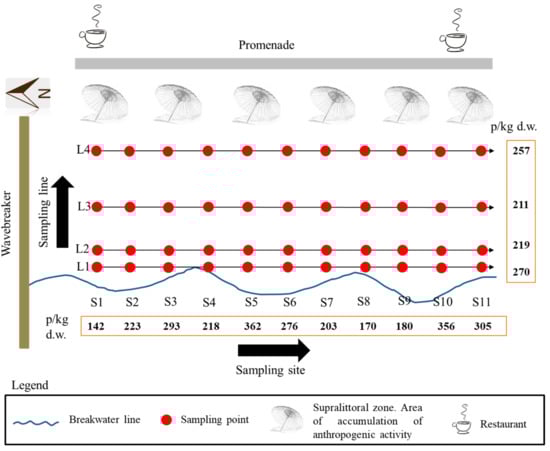 Scheme of the spatial distribution of sediment sampling points along sampling sites (S1, S2, etc.) and sampling lines (L1, L2, etc.) on Costa Nova beach. The concentrations are expressed as the median value at each sampling line and site (p/kg d.w.).
