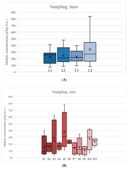 Regarding the longitudinal distribution, the highest median concentration of microplastics was obtained at line 4 (270 ± 196 p/kg d.w.), closest to the promenade, followed by line 1 (257 ± 143 p/kg d.w.), line 3 (219 ± 123 p/kg d.w.), and line 2 (211 ± 169 p/kg d.w.) (Figure 3A). However, there is hardly any disparity in the data, with a very homogeneous distribution observed in all sampling lines. The fact that the highest contamination is present in line 4 may be due to the proximity to the leisure areas. Specifically, two restaurants with terraces are located on the promenade that coincide with the beach extension sampled, in addition to a higher concentration of people settlements at the upper area of the beach, in line 4. On the other hand, line 1 represents the breaking of the waves, and this movement of water can produce a greater contribution of contamination to the sediment. The opposite effect can also occur; so, finding a high or low concentration of MPs on this line can be dependent on the time of day when the samples are taken or the season of the year. Specifically, the presence of heavy rainfall and recurrent storms leads to the occurrence of storm surges capable of carrying distant or non-floating particles and depositing them in the area near the wave breaker when the storm subsides []. On the day of sampling at Costa Nova, the weather was stable and sunny; however, the previous days were marked by heavy rains and winds, which could have produced this phenomenon of increased particle deposition.