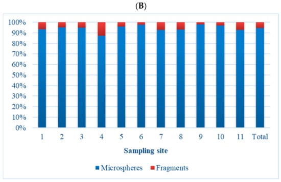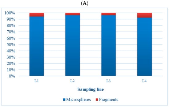 Percentage distribution of microspheres and fragments found in sediments from Costa Nova beach, per sampling line (A) and sampling site (B).