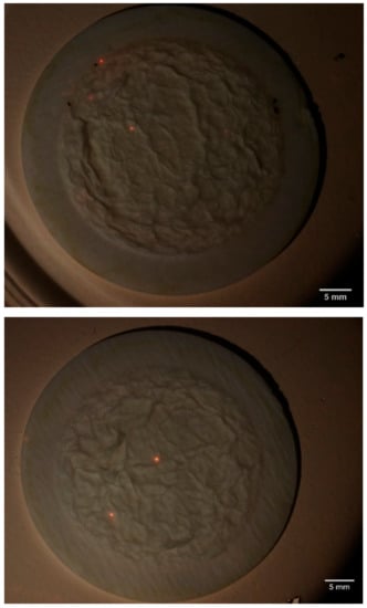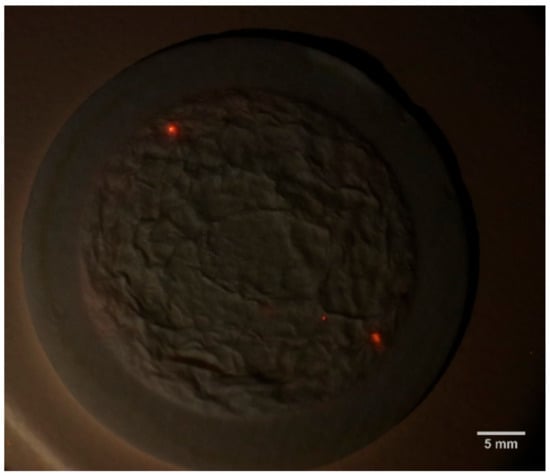 The predominant morphologies in the Costa Nova samples were microspheres (Figure 4), accounting for more than 90% of MPs in all sampling sites and sampling lines except in site S4, which reached around 87%. The median concentrations of microspheres ranged from 142 to 347 p/kg d.w. at sites S1 and S5, respectively. Fragments were found in a much lower proportion, with median concentrations varying between 0 and 28 p/kg d.w. at sites S9 and S4, respectively. With regards to sampling lines, median concentrations of microspheres and fragments ranged between 205 and 257, and 0 and 27 p/kg d.w., respectively. However, the trend in the distribution of morphologies is very homogeneous along all sampling sites and lines, indicating that there are no significant variations along the studied transects and that these microspheres and fragments probably have a similar origin along the whole beach. On the other hand, a total of 54 fibres were also found that were not considered for the study due to the difficulty in discarding them as environmental contamination, given the high number of fibres also obtained in the blanks (Table 1). Figure 5 shows some photographs of the microplastics identified on the filters after staining with Nile Red pigment. These photographs are the most noticeable, but the trend in all samples was the same, with a clear predominance of spherical particles.