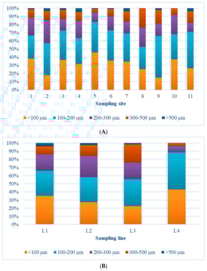 Percentage distribution of MPs’ size classes found on Costa Nova beach by sampling site (A) and sampling line (B).