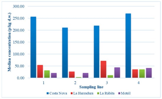 Regarding the correction of sediment weight for moisture, this was performed to be able to refer the concentrations to dry sediment weight and to facilitate comparison with other studies. As expected, the highest moisture was obtained in line 1 and was decreasing towards line 4. Specifically, a mean moisture content of 6.99% ± 0.05% was obtained in the sediment of line 1, 4.88% ± 0.049% in line 2, 3.20% ± 0.01% in line 3, and 1.17% ± 0.006% in line 4. Therefore, with these percentages, the weights of all sediment samples analysed in the laboratory were corrected to refer the results to particles per kg of dry weight (p/kg d.w.).