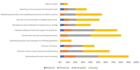 Figure 1). These functions are the remit mainly of institutions at the county level and/or the municipal level, and to some extent institutions at the provincial level. Thus, of all sampled county and municipal level institutions: 78% and 67%, respectively, provide spraying services; 89% and 100%, respectively, implement early warning and preparedness activities; and 78% and 50%, respectively, engage in mobilizing communities and in establishing local locust surveillance systems. Livelihood restoration is carried out only by institutions at the county level, with 89% of all sampled county level institutions in this study reporting that they engage in livelihood protection and restoration for populations that have been affected by a locust outbreak.