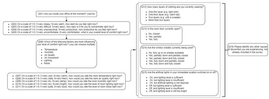The survey questions focused on the perceived alertness, concentration, productivity, and comfort levels of the occupants in their offices. The participants were asked to rate the temperature, air quality, humidity, lighting, and noise levels of their offices. Participants were also able to note the use of window blinds, whether office doors were open or closed, the layers of clothing being worn, and so on. Figure 1 shows the survey question logic and flow.