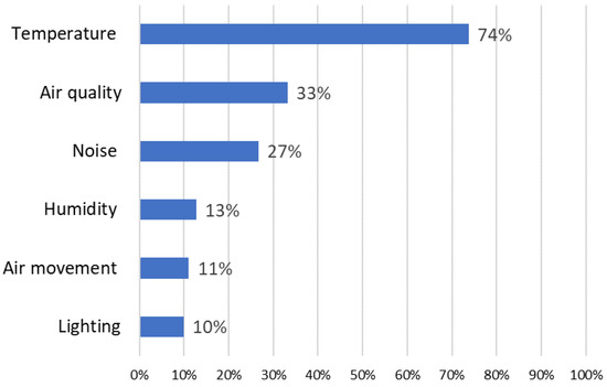 The main experiment was conducted between 15 January and 6 April 2021, which covers the late summer and early autumn seasons in Australia. Several factors influenced the respondent level of environmental comfort. Figure 3 shows that the clearly most influential factor was temperature (74%), followed by air quality (33%) and noise (27%). Other influential factors were humidity (13%), air movement (11%), and lighting (10%). Detailed analyses of the sensor data and participant feedback regarding these factors are presented in the following subsections.