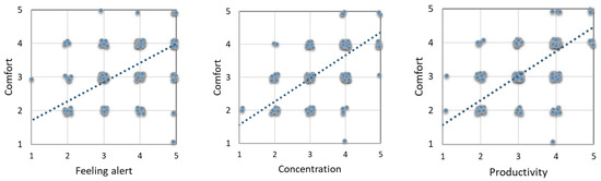 Pearson’s correlation coefficients (PCCs) were calculated to understand the associations among the workplace/office comfort, alertness, concentration, and productivity levels. PCCs are used, as they provide a common statistical measure of linear correlation between two sets of data. There were strong correlations between the comfort and concentration levels (r(231) = 0.61, p = 0) and between the comfort and productivity levels (r(231) = 0.62, p = 0). There was a moderate correlation between the comfort and alertness levels (r(231) = 0.45, p = 0). Figure 10 shows these associations.