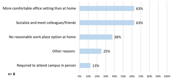 A total of 88% percent of all participants believed that it would be practical to apply this technology in a more general, commercial context. As this research was performed during the COVID-19 pandemic, all participants had the option of working from home. For this reason, they were asked to specify their primary motivation for attending on campus in person to participate in this study. Participants were able to choose multiple answers for all reasons that influenced their decision to work on campus. Figure 12 shows that 63% of all respondents wanted to take advantage of the opportunity to meet and socialize with colleagues and friends on campus. Notably, 63% of participants also stated that they preferred the comfort of the office settings to alternative settings (at home, for example), which broadly aligns with the general level of satisfaction with comfort levels in the office spaces.