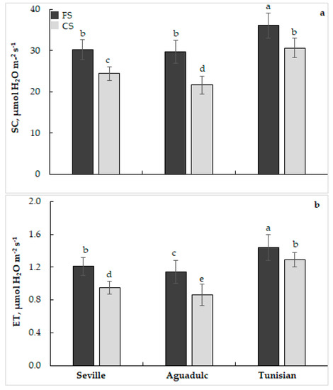 Stomatal conductance (SC, mol H2O m−2 s−1, (a)) and evapotranspiration (ET, mol H2O m−2 s−1, (b)) in faba bean genotypes cultivated on fertile soil (FS) and calcareous soil (CS). According to Fisher’s Least Significant Difference, within columns, means with the same letter are not significantly different at α = 0.05. Bars on the columns represent the standard error of the mean (n = 10).