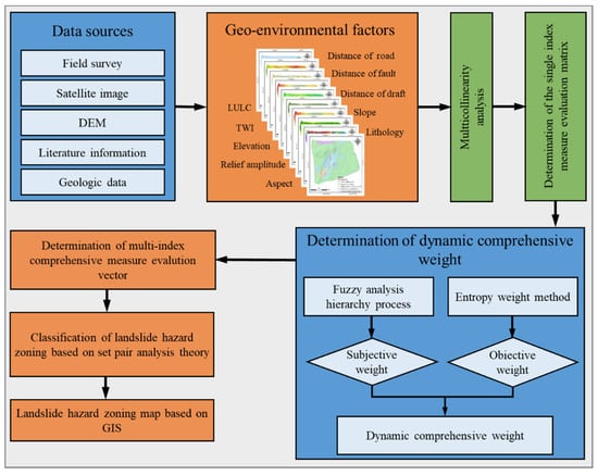 The evaluation method of geological hazard zoning of landslides in mining area mainly includes four parts: the selection of landslide influencing factors, the multicollinearity analysis of evaluation indexes, the calculation of dynamic comprehensive weight of each evaluation index and the construction of the evaluation model. The dynamic comprehensive weight of the evaluation index is determined based on the fuzzy AHP and entropy weight method, and the flow chart of landslide susceptibility zonation in the Tonglvshan mining area is shown in Figure 1.