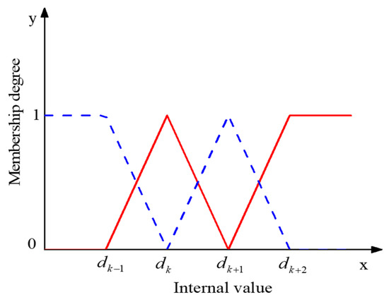 where , represent the lower and upper value of the interval of respectively, and represent the modal value. The triangular fuzzy number can be expressed as: .