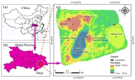 The Tonglvshan mining area is located in Daye City, Hubei Province, approximately 3 km southwest of Daye City and 99 km southeast of Wuhan City. The administrative region is under the jurisdiction of the Jinhu Sub-District Office of Daye City, and its geographical coordinates are as follows: with east longitude 114°55′26″–114°57′19″ and north latitude 30°04′21″–30°05′46″, the mining area is approximately 5.61 km2. The location of the research area is shown in Figure 3. The mining area is low mountain and hilly landform, and the surrounding terrain is high in the south and low in the north. Before mining, the terrain has little fluctuation, and the elevation is 14.5~58.15 m. At present, the topography and geomorphology in the study area have changed greatly under the influence of mining. After the shallow mining resources are exposed, two adjacent open mining pits with a length of approximately 1500 m from north to south and a width of approximately 500 m from east to west have been formed. The slope top elevation of the stope is 30–50 m, the lowest elevation of the pit bottom (southern open-pit) is −175 m and the slope angle of the stope is 46–56.5°. Highway 3 runs between the eastern slope of the North Open Pit Mine and the ancient copper Mine Site Museum [35,45].
