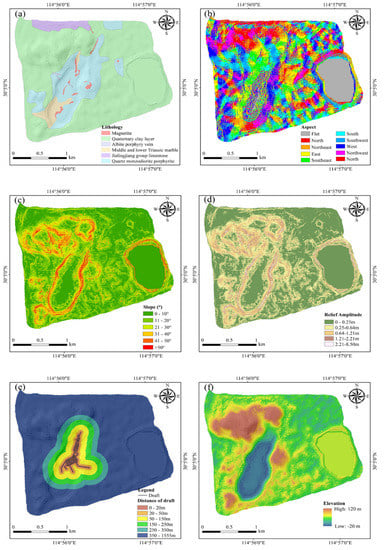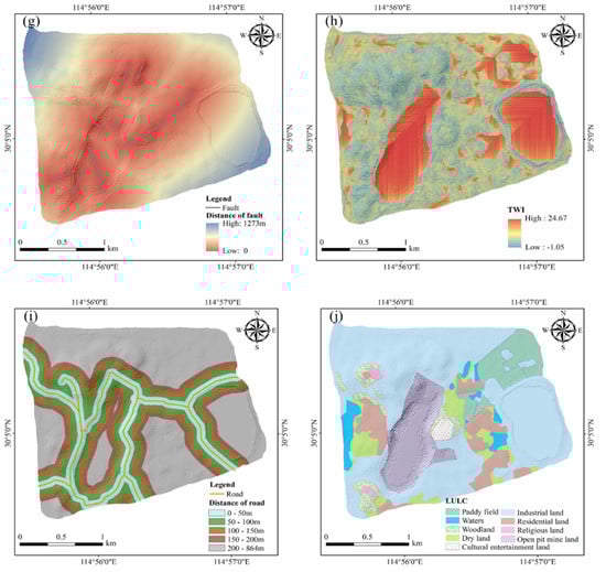 Thematic maps of LCFs in the study area: (a) Lithology, (b) Aspect, (c) Slope, (d) Relief amplitude, (e) Distance of draft, (f) Elevation, (g) Distance of fault, (h) TWI, (i) Distance of road, (j) LULC (Datum reference: WGS 1984, UTM Zone 49N).