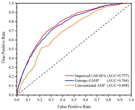 To verify the superiority of the proposed model, it is compared with conventional AHP [9] and Entropy-FAHP [29]. The landslide susceptibility map produced using the conventional AHP and Entropy-FAH is shown in Figure 8. Figure 9 shows the area coverage of five landslide susceptibility levels of the three calculation models, and the paired comparison matrix of conventional AHP analysis is shown in Table 10. Past studies [29] propose that the Entropy-FAHP model also adopts dynamic comprehensive weight to give weight to evaluation indicators, so the subjective and objective weights of the Entropy-FAHP model quoted in this study are provided by conventional AHP and improved UM-SPA method, respectively. The comparative analysis of Figure 6 and Figure 8 shows that the distribution of landslide susceptibility of the three models is similar, meaning that the regions with large susceptibility levels are distributed near the open-pit slope, while the regions with small susceptibility levels are distributed at the edge of the study area, and there are only some differences in local areas. Compared with the conventional AHP model, the susceptibility areas in the landslide susceptibility diagram drawn by the improved UM-SPA model are more concentrated, as shown in Figure 9a,b. The difference lies in that the extremely high susceptibility areas of the conventional AHP model are mainly distributed in the east and west side slopes of the north open pit. The highly prone area of the improved UM-SPA model is mainly concentrated in the east side slope of north open pit, which is also consistent with the geological disaster investigation results. In addition, the results of high susceptibility partitioning between the two models are also significantly different. The reason for this difference is that the conventional AHP model assigns a fixed weight to the whole research area, but cannot reflect the differences of influencing factors in different locations in the research area, thus reducing the accuracy and rationality of the final evaluation results. At the same time, in contrast to the Entropy-FAHP model with dynamic comprehensive weighting, both high and low landslide susceptibility regions are highly similar, as shown in Figure 9a,c. This also proves the superiority of the dynamic comprehensive weighting method in the study of landslide prone regionalization. As can be seen from Figure 7, the AUC value for the LSZ maps produced using the conventional AHP and Entropy-FAHP model are 0.698 and 0.764, The AUC value for the LSZ maps produced using the conventional AHP and Entropy-FAHP Model are 0.698 and 0.764, respectively. Obviously, the improved UM-SPA model has higher prediction accuracy in the study of landslide susceptibility zonation.