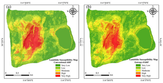 Landslide susceptibility zonation maps. (a) LSZ produced by conventional AHP; (b) LSZ produced by Entropy-FAHP.