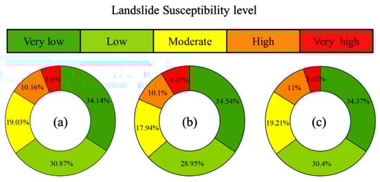 Landslide susceptibility classification and distribution statistics: (a) produced improved UM-SPA model, (b) produced by conventional AHP, (c) produced by Entropy-FAHP.