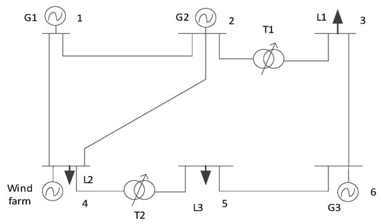 The simulation example includes three conventional generator sets, one wind farm, five lines, one inverter, and two transformers with transformation taps. The system wiring diagram is illustrated in Figure 3. Subsequently, the pumping and storage process at a pumped storage power station is equivalent to load change. The standby demand for positive rotation of conventional units is 20 MW, and the standby demand for negative rotation is 2% of the minimum load of the system. Parameters of conventional units and lines can be discovered in Ref. [39].