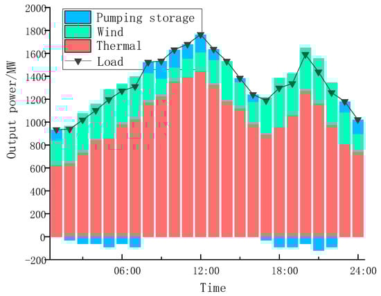 Figure 4 is the unit output in this example. It can be seen from Figure 4 that the output of the system unit can meet the load demand at any time in the scheduling cycle without a power shortage. The pumped storage power station has been in a state of power generation from 08:00~16:00, which is due to the high system load during this period. In order to make up for the fluctuation of wind power and ensure the stability of the system’s power supply, the pumped storage unit needs to be in a state of discharge and able to adjust the power generation output at any time. The pumped storage power station is in the state of electricity at 01:00~07:00 and 17:00~22:00, mainly because the power station needs to be in the state of electricity in order to absorb more wind power at this time. Therefore, the scheduling method based on the imperialist competitive algorithm proposed in this paper is correct and effective in solving UC problems with wind farms and pumped storage power stations.