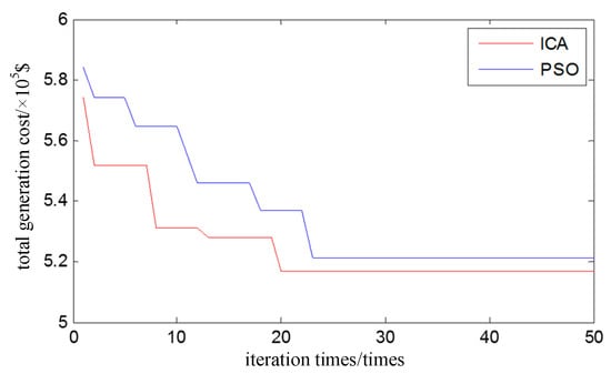 It can be seen from Table 5b that the scheduling plan obtained by the imperial competition algorithm can effectively reduce the total cost of power generation. Compared with the standard particle swarm optimization algorithm, the total cost of power generation is reduced by $4508.9, and the optimization result is better. While its CPU time is shorter, 18.1 is less than the standard particle swarm algorithm.
