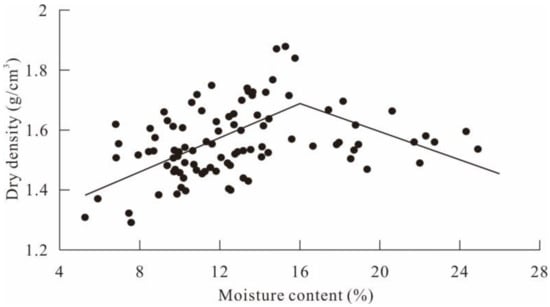 By analyzing the relationship between the compaction effect and the water content of loess in this research, the relationship between dry density and the water content of loess is drawn in Figure 3. It shows that with the increase of mass water content, the dry density of the disturbed loess shows an initial increase and then decrease trend, and the dry density reaches the maximum when the mass water content is around 16%. Therefore, when the water content of the filled material is adjusted to about 16%, the best compaction effect can be achieved in practical engineering. This finding can be useful in instructing practical compaction engineering so that the loess can achieve the highest compaction effect. In addition, this finding can also facilitate the preparation of laboratory loess specimens.