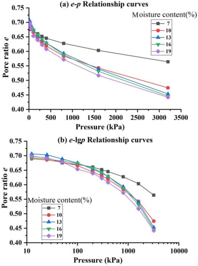 In this paper, the effective pressure and pore ratio during the compression of disturbed loess were analyzed. The pore ratio versus effective pressure curves (e-p) and pore ratio versus effective pressure logarithmic relationship curves (e-lgp) under different water content conditions are shown in Figure 4. Figure 4a shows that with increasing compression load p, the loess samples are gradually compacted, and the void ratio e decreases. With increasing water content, the deformation resistance is obviously weaker, and the void ratio decreases more and more. Therefore, the lower the e-p curve is, the higher the soil water content and the greater the compressibility. In situ loess is a kind of under-compacted soil with low structural strength. Due to the influence of human activities, disturbed loess destroys the original structure of loess by filling and compaction, forming a new secondary structure [40].