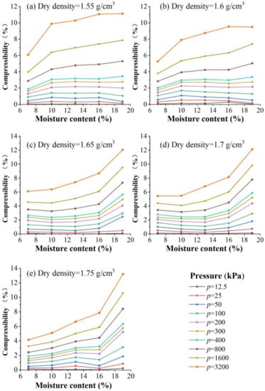Figure 5 shows the relationship of the compression deformation coefficient with sample moisture content under different loads. Figure 5 indicates that under dry density, when the water content is less than 10%, the compression coefficient increases rapidly with the water content, and when the water content is greater than 10%, the compression coefficient increases slowly with the water content. Because the sample is disturbed loess, when the loess skeleton with weak strength is formed inside the soil sample, the water content is small, and large pores are formed inside the soil sample, resulting that the sample can withstand less external load [47]. Under certain loading conditions, the loess skeleton is destroyed, accompanied by a relative slip between the particles; local small particles fall into the pores, and the soil immediately disintegrates, destroying the entire structure [48].