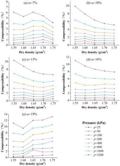 - The compressive deformation coefficient generally decreases with increasing dry density and increases with increasing water content under different loading conditions. However, in the case where both the dry density and the water content are small, the compression coefficient increases with the dry density for a range of dry densities due to the easy formation of cohesive structures in soil. In the case of a larger dry density and water content, the compressibility rapidly becomes larger as the dry density and water content increase since it is closer to saturated soft loess.