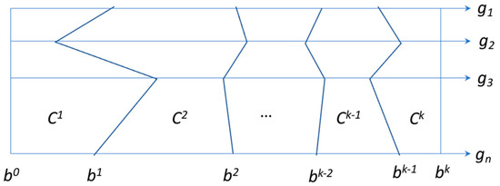 The ELECTRE-TRI method [33] aims to assign each of the m alternatives ai (i = 1, …, m) under evaluation to predefined ordered categories of merit considering a set of n evaluation criteria gj (j = 1, …, n)—sorting problem. Each category is delimited by two reference profiles: bjh−1/bjh are the lower/upper limit of category Ch (h = 1, …, k) for criterion gj (Figure 1).