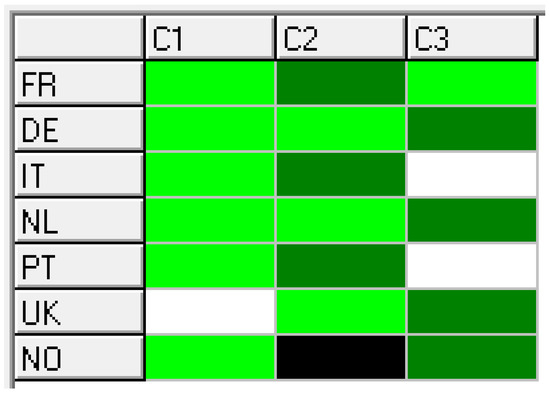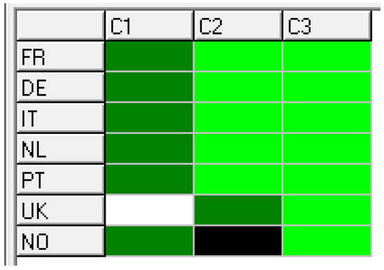 The assignment results after increasing the classification exigency corresponding to imposing the cutting level λ ≥ 0.66 (i.e., a “qualified majority” of criteria is required in favor of the concordance to validate the outranking relation) are displayed in Figure 3. With the central combination of weights, no country attains the best category C3, with France, Germany and the UK assigned to the middle category C2 for the central weight combination. The United Kingdom is never classified in the lower category C1.