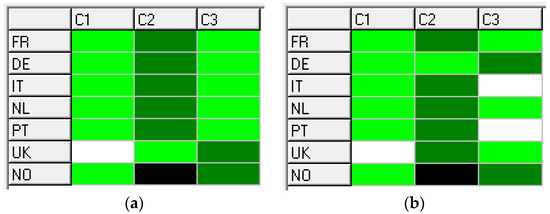Figure 6 displays the assignment results if the relative importance between the set of fiscal and non-fiscal incentive criteria is translated into the weight constraints k3 + k4 ≥ k1 + k5 (a) and k1 + k5 ≥ k3 + k4 (b), thus representing decision makers with different perspectives or who want to assess the change in the results resulting from distinct preference information to reach more robust conclusions.