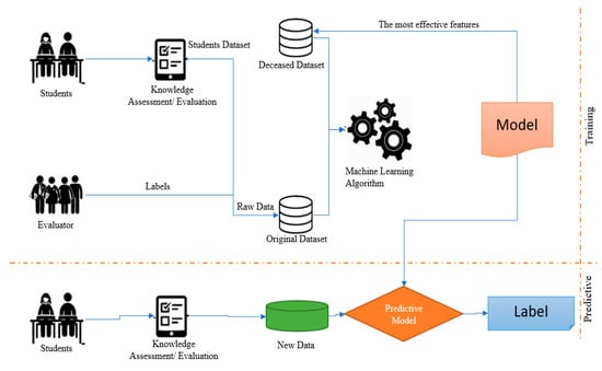 Figure 1′s knowledge assessment/evaluation survey was used to gather the necessary data from students, which was, subsequently, individually labelled and entered into the existing dataset by the evaluators. Effective models with good performance were discovered after the ML models had been fitted to the data. The essential elements were then chosen from the original information and re-added to the smaller database for use in the models and for student evaluation. The data from the smaller database was also used to retrain the ML models. ML models can now evaluate students with high accuracy, meaning that human assessors are no longer required to predict student achievement.