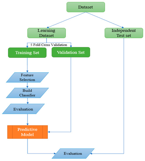 Figure 2 below, a dataset where the learning dataset and the independent test set are separated. We used 5-fold cross validation with the training and validation sets from the learning dataset. The best prediction model and dataset are evaluated after the feature selection, classifier construction, and evaluation with the training set.