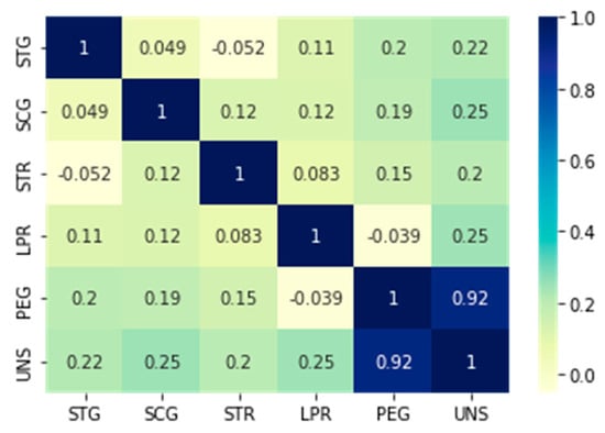 In the second experiment, correlation analysis was used to determine the impact of a more minor characteristic or feature collection. Here, we saw that the UNS, the student’s degree of knowledge, and the STR, or the amount of time the student spends on related learning materials, have just the slightest correlation. As a result, the feature vector was simplified to be composed of the following features: PEG, LPR, SCG, and STG. This condensed feature set produced a condensed dataset (Dataset 2). In this smaller dataset, the same methodology was used as in the initial experiment, and the same assessment criteria were used to calculate the results.