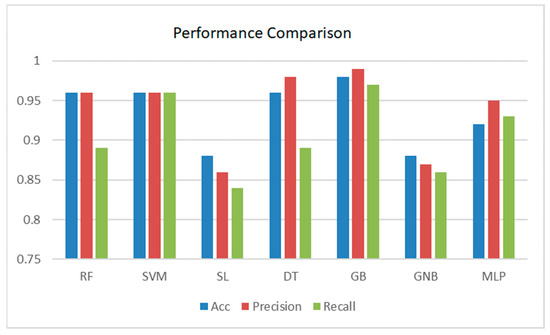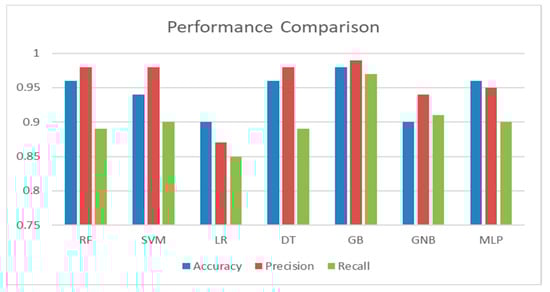 According to the data, the GBM exhibited the highest prediction accuracy, 98%. In terms of prediction error, the GBM also performed well. In terms of performance, RF, DT, and MLP were on a par with the GBM. The performance could be better when using linear classifiers like SVM or LR. At this level of testing, the tree-based classifiers performed better.