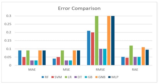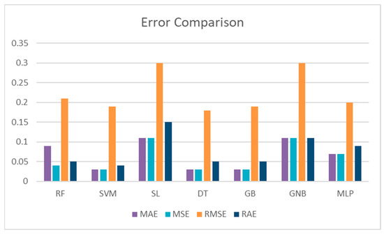 The tree-based classifiers outperformed the linear classifiers in terms of precision and recall. The GBM made predictions with 99% accuracy, and DT and RF made predictions positively with 98% accuracy. The GBM displayed a 97% recall rate of accurate predictions. With the dataset, the MLP achieved 96% accuracy, 95% precision, and 90% recall, performing well for multiclassification. The GBM outperformed the other classifiers when the prediction error was taken into account. The error measure comparison of the classifiers is shown in