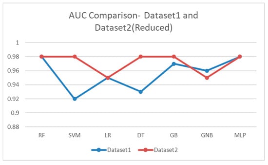 Figure 11 displays an AUC comparison of the two models using Datasets 1 and 2. In both experiments, we used the one-versus-rest AUC-ROC weighted to prevalence. The AUC results are encouraging in the trial with a smaller feature set. However, even when one attribute is avoided, the prediction systems exhibit exceptional discrimination.