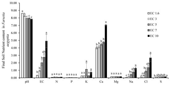 Final Nutrient Content (N—Nitrogen, P—Phosphorous, K—Potassium, Ca—Calcium, Mg—Magnesium, Na—Sodium, Cl—Chloride, and S—Sulphur, in (a) Root and (b) Shoot of Farsetia aegyptia. (Control: EC 1.6). The means followed by the same letter are not statistically different at p 0.001.