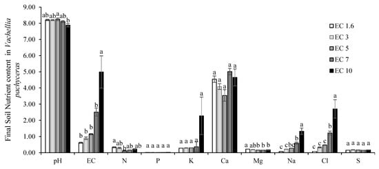 Average final soil nutrient content in Vachellia pachyceras. (Control: EC 1.6). The means followed by the same letter are not statistically different at p 0.001.