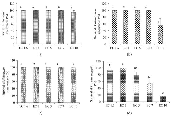 Effect of different salinity treatments on survival of (a) Vachellia pachyceras; (b) Rhanterium epapposum; (c) Haloxylon salicornicum; and (d) Farsetia aegyptia. (Control: EC 1.6). The means followed by the same letter are not statistically different at p 0.001.