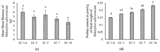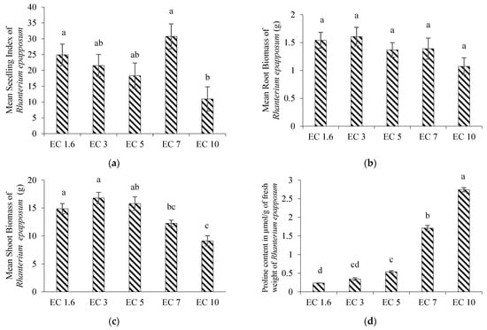 Effect of different salinity treatments on plant parameters of Farsetia aegyptia: (a) Seedling Index; (b) Root Biomass; (c) Shoot Biomass; (d) Proline Content. (Control: EC 1.6). The means followed by the same letter are not statistically different at p 0.001.