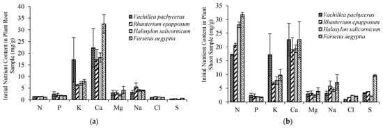 Initial Plant Nutrient Content (N—Nitrogen, P—Phosphorous, K—Potassium, Ca—Calcium, Mg—Magnesium, Na—Sodium, Cl—Chloride, and S—Sulphur, in (a) Root and (b) Shoot of the test species.