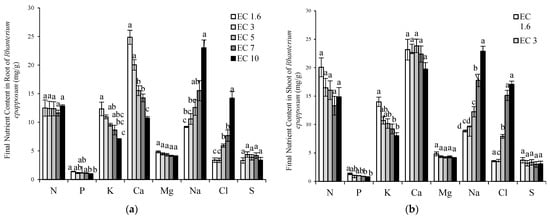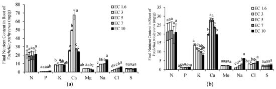 Final Nutrient Content (N—Nitrogen, P—Phosphorous, K—Potassium, Ca—Calcium, Mg—Magnesium, Na—Sodium, Cl—Chloride, and S—Sulphur, in (a) Root and (b) Shoot of Vachellia pachyceras. (Control: EC 1.6). The means followed by the same letter are not statistically different at p 0.001.