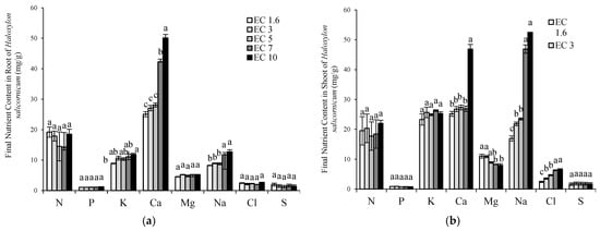 Final Nutrient Content (N—Nitrogen, P—Phosphorous, K—Potassium, Ca—Calcium, Mg—Magnesium, Na—Sodium, Cl—Chloride, and S—Sulphur, in (a) Root and (b) Shoot of Haloxylon salicornicum. (Control: EC 1.6). The means followed by the same letter are not statistically different at p 0.001.