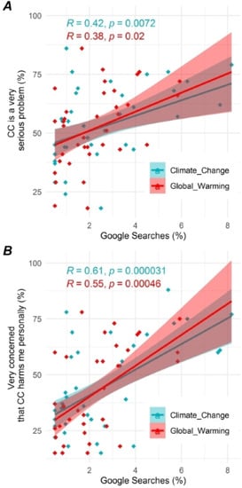 Data generated by search engines and social media have the potential to provide interesting insights into patterns and trends of public interest on environmental topics but only after a careful assessment and validation process [21,32,33]. Here, Google searches by country on the topics “climate change” (CC) and “global warming” (GW) were compared with the percentage of interviewers who considered CC/GW a “very serious problem” (Figure 1A) or who were “very concerned” (Figure 1B). The significant relationships found in Figure 1 highlighted that the public interest in CC/GW manifested through Google searches provided insights into worldwide awareness and concern about the CC/GW issue. Both the CC/GW topics showed significant correlations, although the Google searches on the CC topic seemed to be more representative. This was likely due to the more diffuse use of the CC than the GW term in recent years [34]. It was interesting that searches on the topic of CC seemed to represent people who are worried about the possible risks to their own safety (Figure 1B) more than a general awareness of the potential risk of CC (Figure 1A).