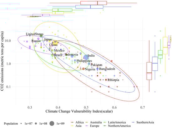 The graph of climate inequity: vulnerability index (ND-GAIN Country Index) vs. carbon dioxide emissions per capita (174 countries). Bubble size is a function of the country’s population (source: [31]). The widths of the boxplots represent the number of countries belonging to each geographical grouping.
