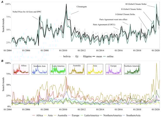 Global and regional trends for the topic of climate change. (A) Validation of the proposed procedure for geographically grouping Google Trends data: global aggregation. The green line represents data provided directly by Google Trends. The black line is the transformed trend aggregating absolute frequencies by country and the resulting trend made relative to the global Google searches as a mean of the three gray trends. Each of the gray trends were obtained using a different scale country (Fiji, Bolivia, and the Philippines). (B) Application of the procedure: regional aggregation. Trends were transformed by aggregating absolute frequencies by country, and the resulting trends were made relative to Google searches by region. Data were then scaled (0–100) using Australia as a scale group. Each of the seven inserts represent transformed trends by region but scaled using their own scale factors. All y-axes were unitless and expressed the relative changes in search volumes, where 100 represents the month in which the highest proportion of all Internet searches was for the CC topic.