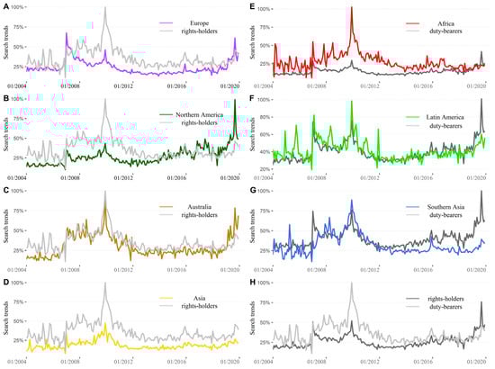 In recent decades, Australia and Africa have shown to the rest of the world a greater public interest in the topic of CC (main graph of Figure 3B). Generally, all regions show two peaks, the first occurring in the 2007–2009 period, due to the Nobel Prize and Climategate, and the latter in 2019, related to the “Greta Thunberg Effect”. The inserts of Figure 3B point out that for rights-holder countries (first three graphs), the former peak was well pronounced, while the reaction to the “Greta Thunberg effect” was weak. In contrast, for the duty-bearer countries (last four graphs), except Asia, the second peak was more prominent, particularly in Northern America.
