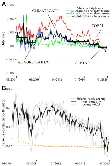 Impact of the main historical CC media events on climate equity. (A) Relative differences (Equation (10) in Supplementary Material) between each rights-holder region (Africa, Latin America, and Southern Asia) and their grouping (black line) with respect to the overall duty-bearer grouping as a reference. Points of change (straight lines) were identified using the package “strucchange” in R software v 4.0.3. Seasonal components were removed from the data (Figure 4 and Figure 5) through the decomposition offered by the “seasonal” R package (X-13ARIMA-SEATS). (B) Temporal variation in Pearson’s coefficient calculated between the CC vulnerability expressed with the ND-GAIN Country Index for 2017 (last available year) and transformed Google searches on CC topics by country (approximately one hundred countries compared monthly). Gray lines represent the Pearson’s coefficient trends related to Google searches obtained using different scale countries (Fiji, Bolivia, and Philippines). The black line is the mean of these trends. A p-value = 0.05 is associated with the dashed orange line.
