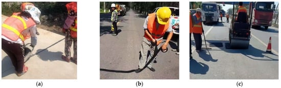 Traditional repair methods of crack and pothole: (a) pouring cracking, (b) sealing cracking, (c) digging-patching of potholes. (@Tai’an City Fang Shuo Engineering Materials Co., Ltd.).