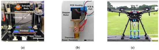 Equipment of 3D asphalt printing technology: (a) whole system of 3D asphalt printer, (b) complete extruder of 3D asphalt printer [90], (c) a six-rotor unmanned aerial vehicle (UAV) with a delta-style 3D printer [91].