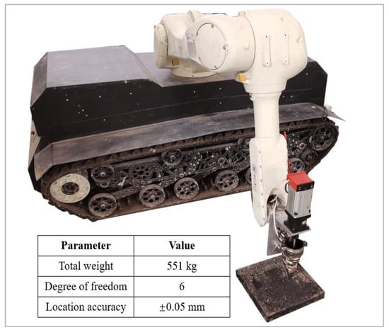 Figure 3 shows a mobile 3D asphalt printing robot (hereafter referred to as “equipment”) from the Hebei University of Technology. The equipment mainly consists of a lithium battery crawler vehicle, a robotic arm, an image acquisition system of pavement distress, a screw feed component, and a control system. The crawler vehicle is used to carry other components and move flexibly during the maintenance of early cracks and light potholes in asphalt pavements. The robot arm base can rotate 360 degrees, and the large arm and small arm can rotate 90 degrees and 180 degrees, respectively, ensuring flexible and accurate movement of the screw feed component at the end of the robot arm. The image acquisition system of pavement distress is used to collect information on early cracks and light potholes in pavement to provide a foundation for building 3D digital models, either with digital cameras or 3D laser scanners. The screw feed component is used to heat asphalt and extrude it precisely with 3D printing path planning and detection of the required amount. After the control system builds 3D digital models of the asphalt pavement distress using the image acquisition system, the results of slicing and path planning would be determined by the slicing software. Then, the movement of the robot arm is controlled to extrude fused asphalt from the extrusion nozzle to ensure the cooperative operation of equipment components in 3D printing maintenance of early cracks and light potholes.